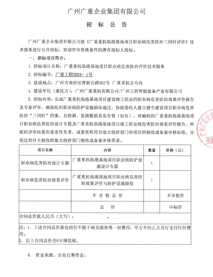 廣重重機臨港基地項目職業(yè)病危害防治三同時評價技術服務項目招標公告
