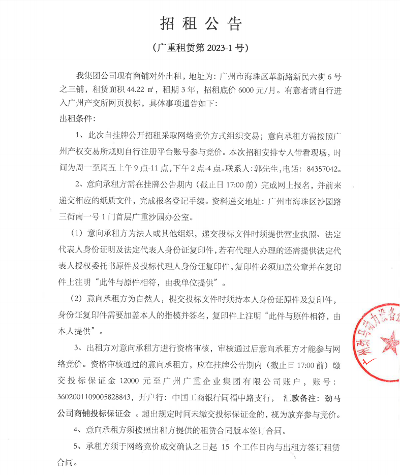 招租公告(廣重租賃2023-1號)